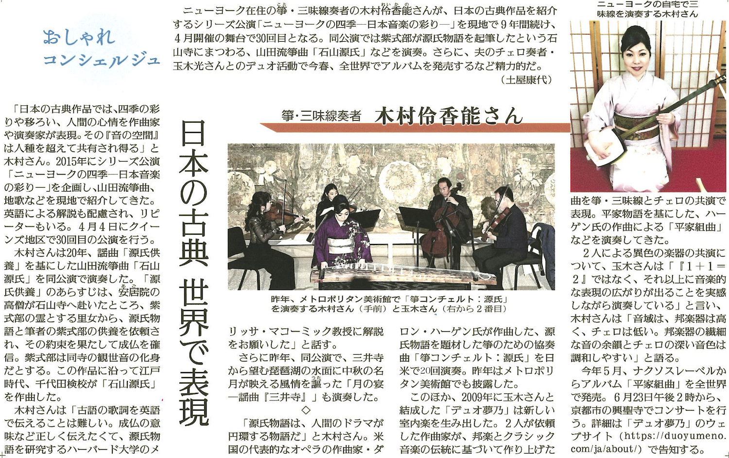 Kimura’s extensive interview was featured on the Yomiuri Shimbun’s Shiga edition published on March 1, 2024. Kimura talked about new album “Heike Quinto” (composed by Daron Hagen), her concert series, “Four Seasons in New York – Gems of Japanese Music” and her passion for koto concerto.