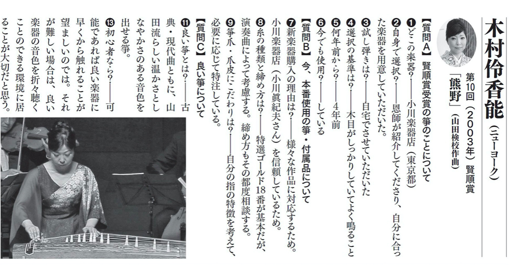 As a winner of the Kenjun Memorial Koto Competition, Kimura was featured on the special article, “What makes a good koto sound?”. Hogaku Journal is most popular monthly Japanese magazine about Japanese classical instruments.