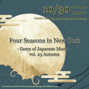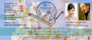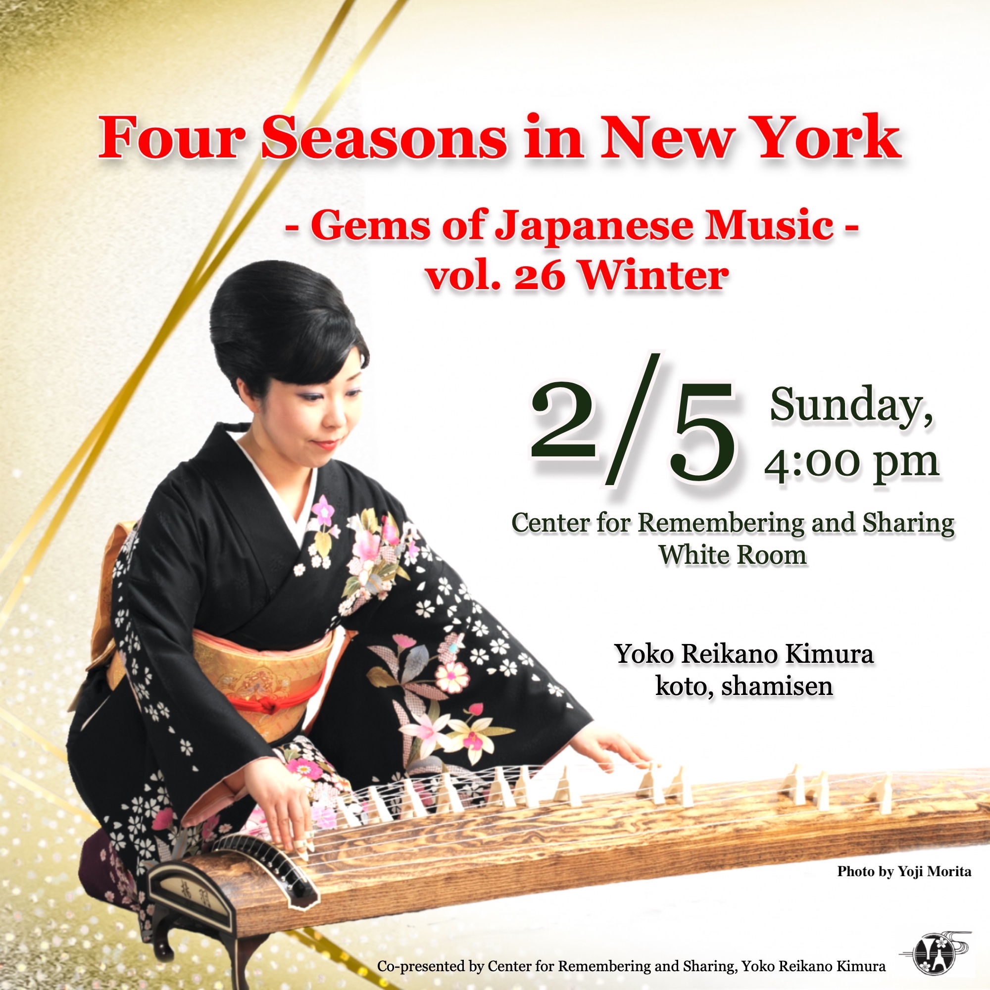 New York’s music scene reflects the diverse and vibrant culture of the city. Yoko Reikano Kimura began “Four Seasons in New York” concert series in the fall of 2015. As a Japanese instrumentalist, Kimura hopes to introduce the brilliance of traditional Japanese music, which is still being passed on to future generations after many centuries. Since the first concert, over 50 works from the classical repertoire have been introduced in the concert series. Please come and experience the sounds of Japanese Music!