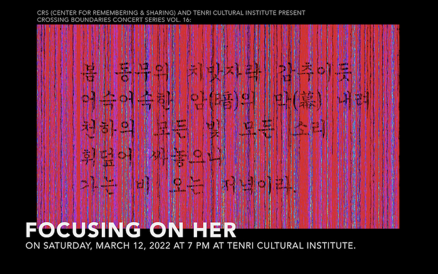 FOCUSING ON HER features three female musicians — Amirtha Kidambi (Indian-American, voice/saxophone), Yoko Reikano Kimura (Japan, shamisen), and gamin (Korea, saenghwang) — improvising and performing music by female composers: Amirtha Kidambi (Indian-American), Yoko Sato (Japan), and Yoon-Ji Lee(Korea), with visual projection designed by Bang Geul Han (Korea). Each of the compositions is a prayer or elegy for those who endure or have endured trauma.