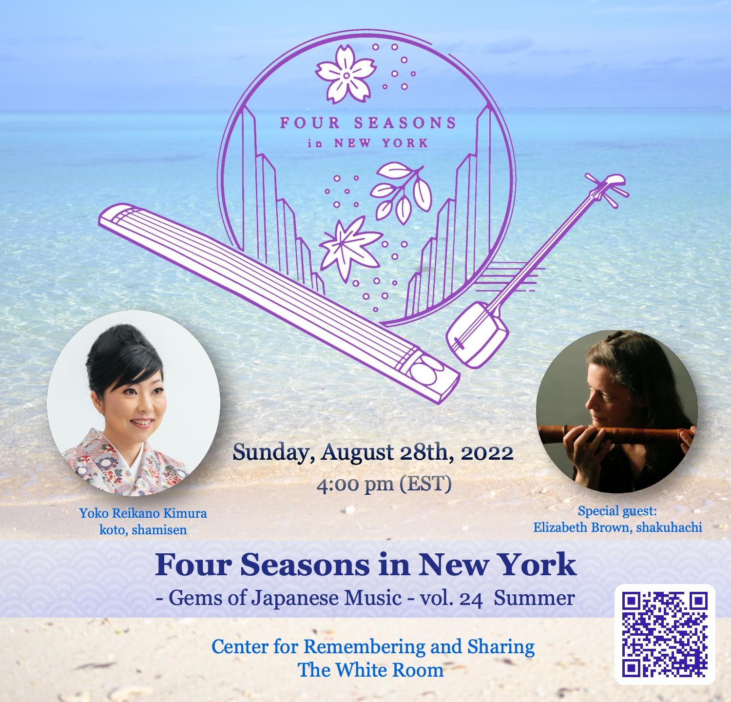 The 24th concert of “Four Seasons in New York” will be held on Sunday, August 28th. Special guest will be Elizabeth Brown (kinko-ryu shakuhachi player.)
