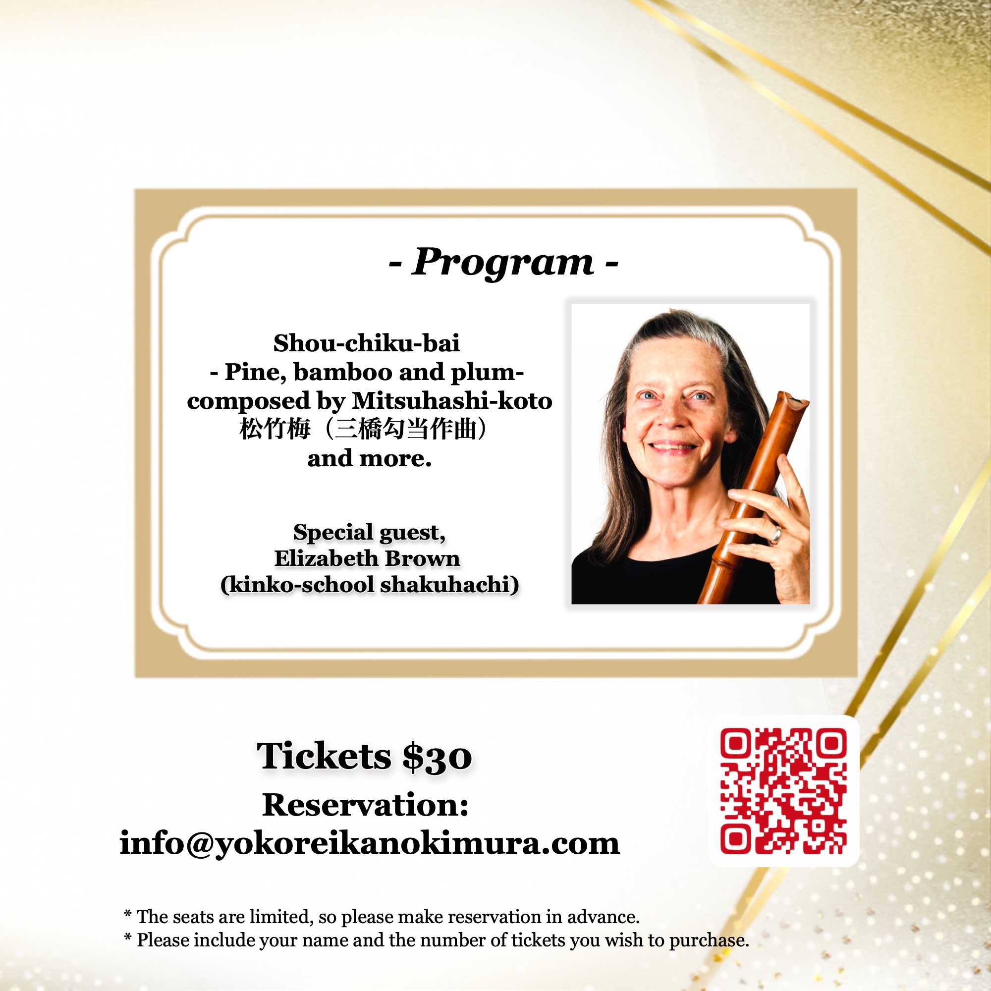 The Winter program of 2022-2023 will feature one of most well-known classical koto repertoire, Shouchikubai celebrating new year. More details will be announced soon, so please save the date.