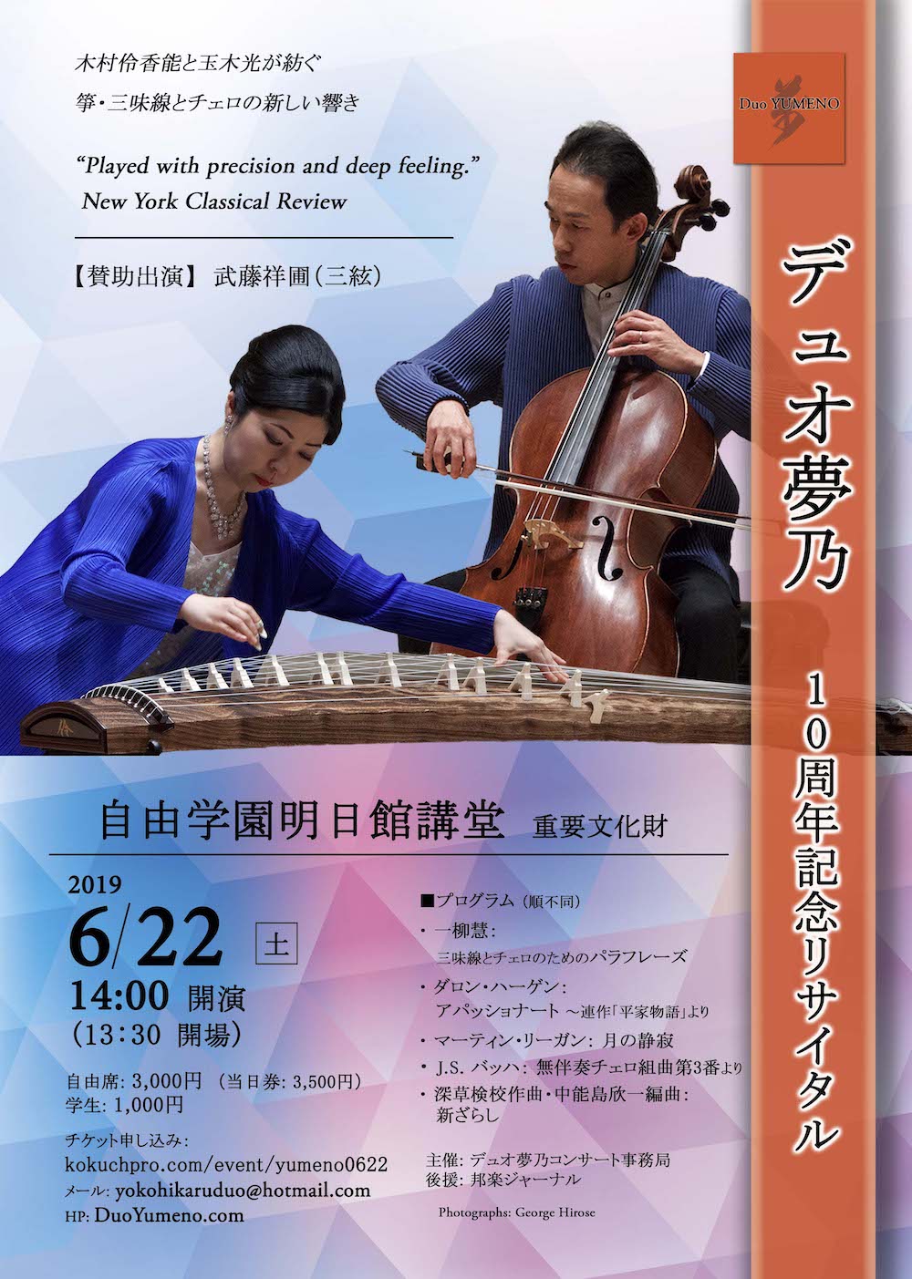 自由学園明日館講堂(重要文化財)での東京公演です。デュオ夢乃結成10周年として、これまでの委嘱作品など多彩なプログラムです。一柳慧氏による委嘱作品「三味線とチェロのためのパラフレーズ」も日本初演致します。