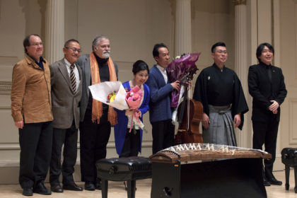 There is an article about Duo YUMENO 10th Anniversary Recital at Carnegie Hall, Weill Recital Hall which was held on Saturday, March 2, 2019.  Duo YUMENO answered the curtain call with the composers and colleagues. (R to L: Reona Ito, guest speaker / Shoho Mutoh, guest performer, shamisen / Hikaru Tamaki, cello / Yoko Reikano Kimura, koto and shamisen / Daron Hagen, composer / Sayaka Ishiguro, composer /Marty Regan, composer) Photo credit by George Hirose 2019 NY Seikatsu Press, (Mar 23, 2019)