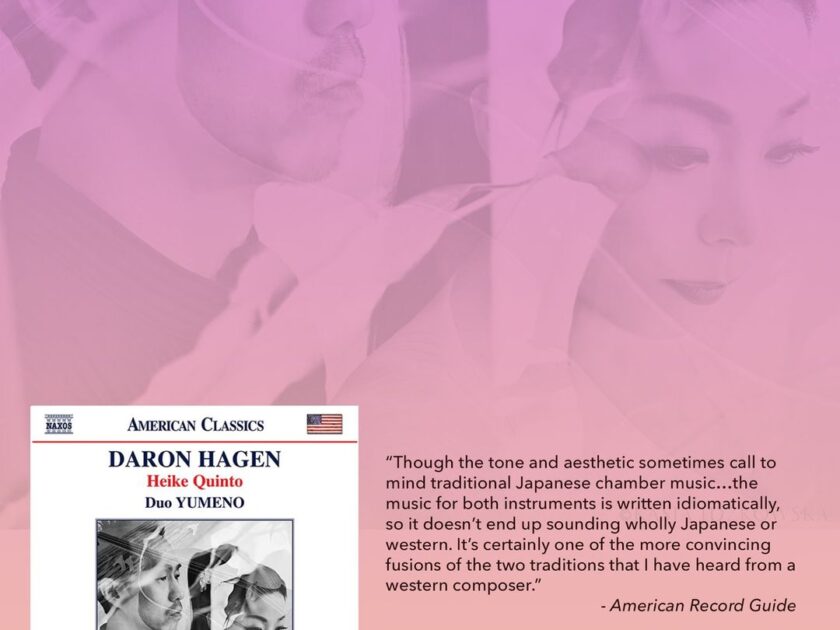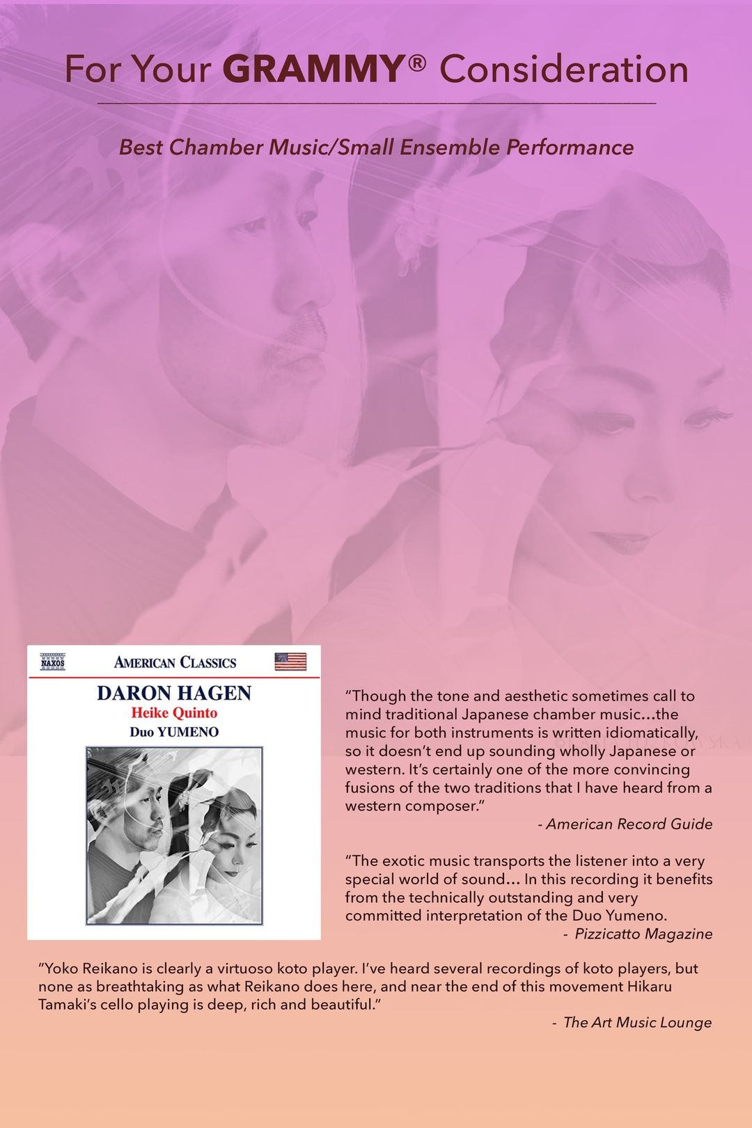 Please accept Duo YUMENO 夢乃’s world-premiere recording of Daron Hagen’s CD-length work for koto, cello, voice, and fixed media “The Heike Quinto” for your GRAMMY® nomination consideration in the category of Best Chamber Music / Small Ensemble Performance. (September 20, 2024)